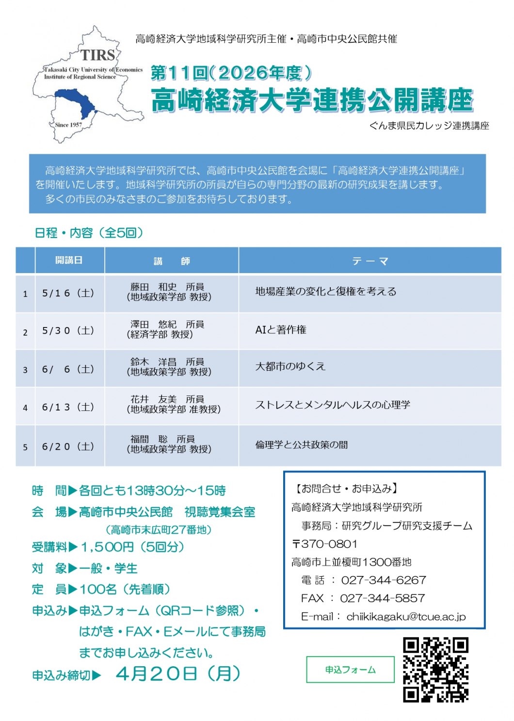 高崎経済大学地域科学研究所では、高崎市中央公民館を会場に「高崎経済大学連携公開講座」を開催しています。(高崎市中央公民館共催)
