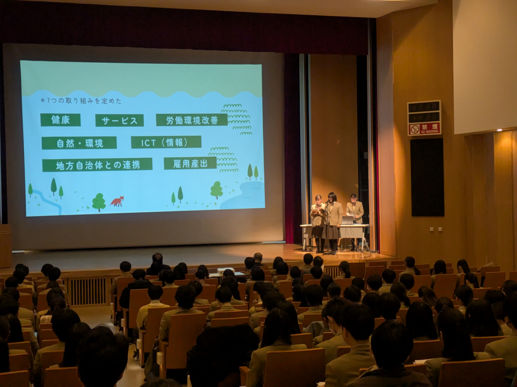 発表では、各班代表の大学生、高校生による英語スピーチに加え、対象企業の現状や課題、改善に向けた提案について報告されました。