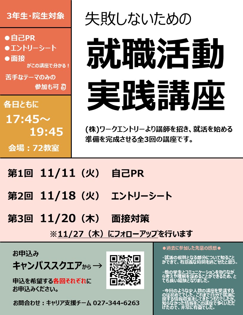 ㈱ワークエントリーより講師を招き、「自己PR」「エントリーシート対策」「面接対策」など、就職活動に必要な事柄を網羅的かつ実践的に学ぶ全3回の講座です。