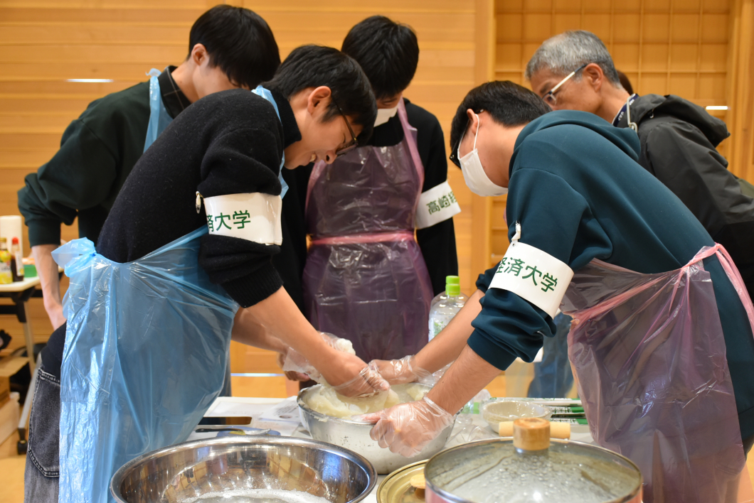 イベントは、小栗上野介ゆかりの東善寺様にご協力いただき、学生達による小栗様の魅力を伝えるミニガイドを実施しました。また、道の駅くらぶち小栗の里と、倉渕町の農家の女性たちによる農産加工を行う「あじさいグループ」の原田カヅ子様にご指導をいただき、こんにゃくづくり体験を行いました。おきりこみの昼食時には、学生らによる倉渕の魅力を伝える映像を上映しました。