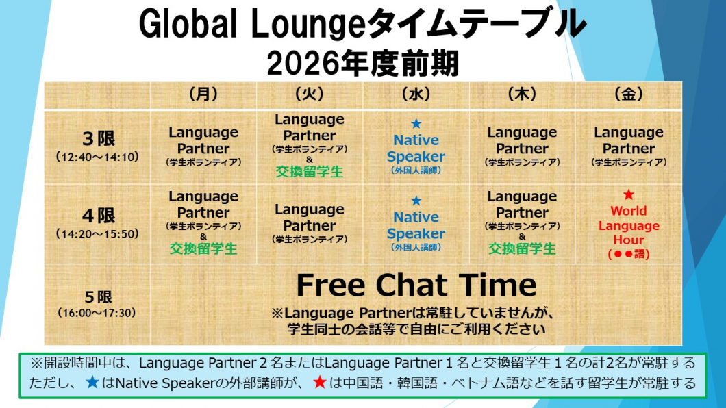 ●心強いサポートメンバー:会話をリードしてくれる学生スタッフ「Language Partner(LP)」や交換留学生に加え、水曜日にはネイティブスピーカーの外国人講師も常駐し、皆さんの交流をサポートします