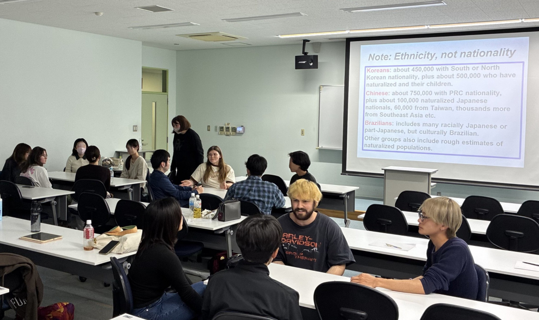 4月13日(月)に行われた第1回授業では、「日本は単一民族か、それとも多民族社会か?」をテーマに取り上げました。授業では学生がグループに分かれ、それぞれの視点から意見を出し合いながらディスカッションを行いました。議論の後には、各グループが考えをまとめ、英語で発表を行いました。