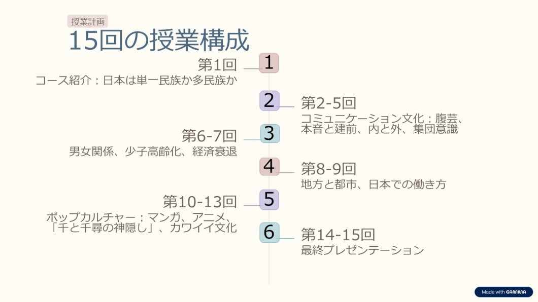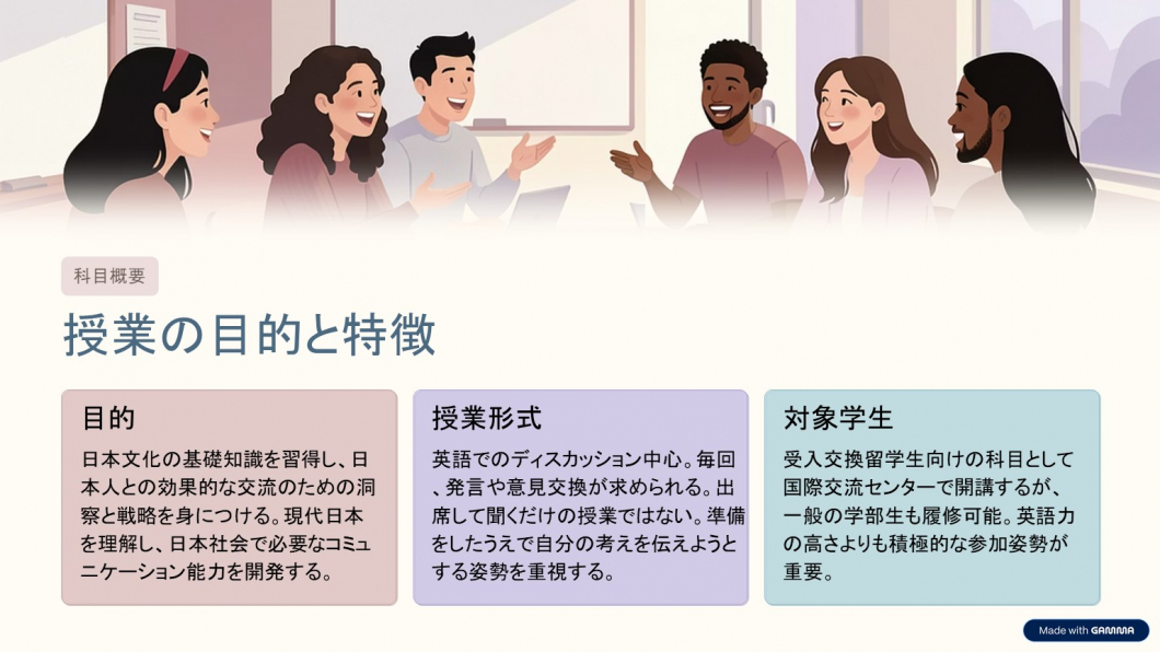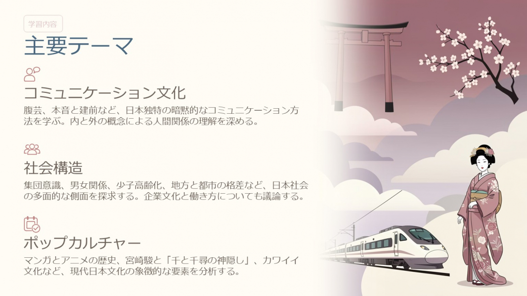 この授業では、日本社会や文化について多角的に考察し、「本音と建前」や「内と外」といった日本独特のコミュニケーション文化、働き方や少子高齢化といった社会課題、さらにはマンガ・アニメなどのポップカルチャーまで、幅広いテーマを扱います。学生は事前に資料を読み、授業内で自らの考えを英語で発信しながら理解を深めていきます。